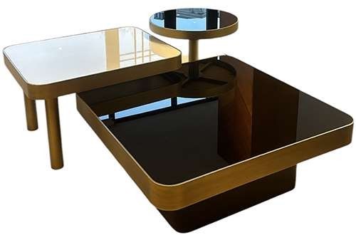Metal, ayna ve lake cilalı MDF’nin uyumuyla ortaya çıkan bu üçlemenin her biri kendine özgü zarafetiyle odalara dinamik bir estetik katıyor.